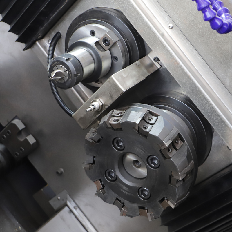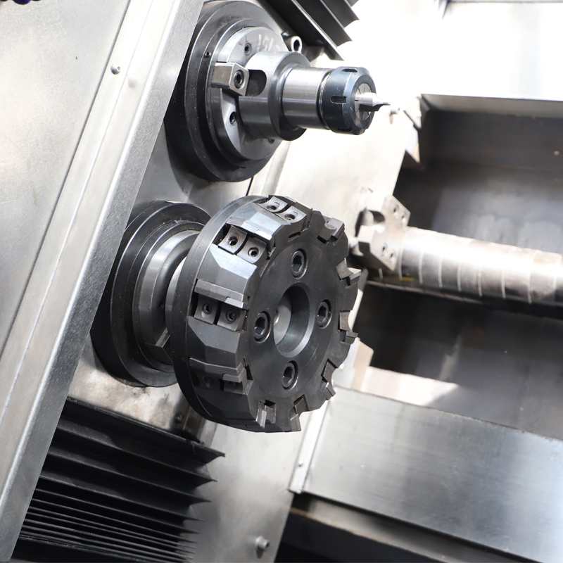 设备采用四轴Z1、X1,Z2、X2坐标结构驱动,伺服系统控制,可以对各种轴类零件一次装夹,同时完成两端面铣削、钻中心孔加工、攻螺纹等加工。